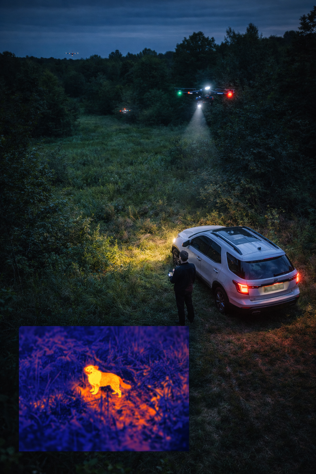 In addition to aerial services, we offer drone-assisted pet recovery using advanced thermal imaging technology to help locate lost pets quickly and safely. Our approach is designed to reduce stress, cover large areas efficiently, and provide families with peace of mind during difficult situations.